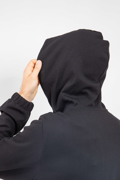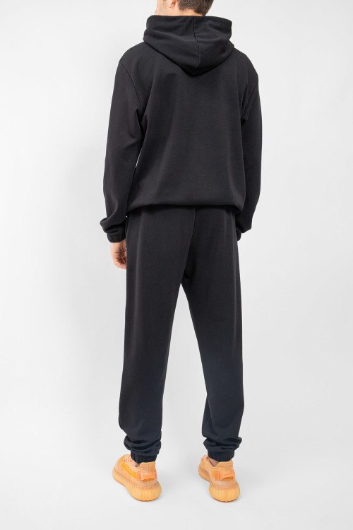 Мужской черный спортивный костюм из хлопкового микса от EA7 Emporio Armani (ЕА7 Эмпорио Армани). Спортивная кофта на молнии, капюшон с кулиской, контрастные вставки, прорезные карманы, спортивные брюки с манжетами, прорезные карманы.