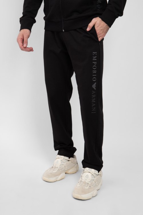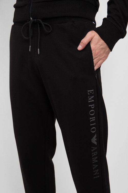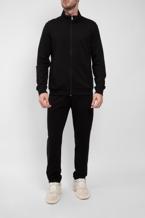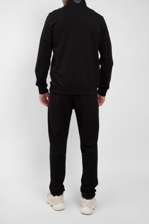 Мужской черный хлопковый спортивный костюм от Emporio Armani (Эмпорио Армани). Кофта: вышитый логотип сбоку, боковые карманы, высокий воротник, застежка-молния, классическая длина, трикотажные манжеты и нижний край. Брюки: эластичный пояс на завязках, боковые карманы, вышитый логотип сбоку, полная длина, низ без манжетов.