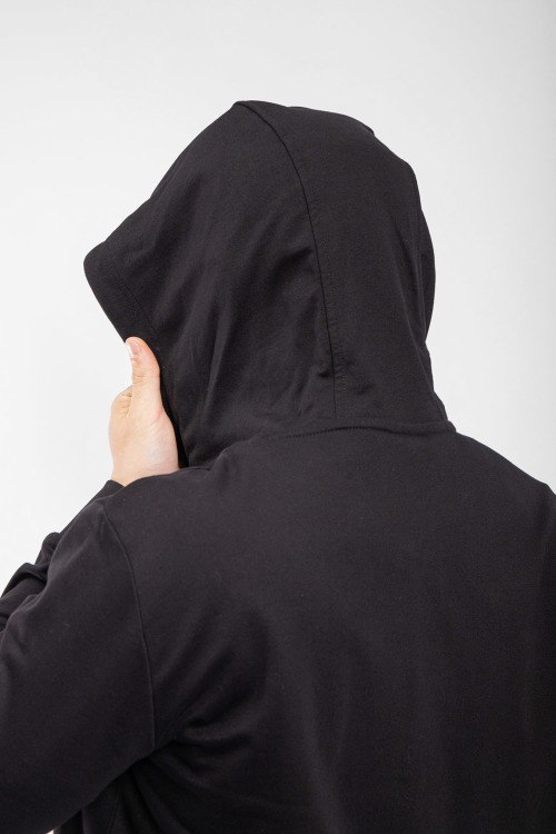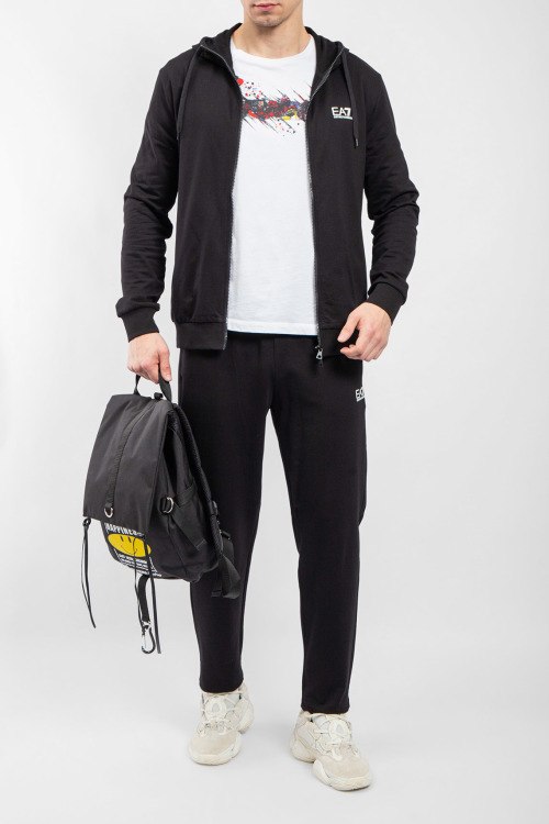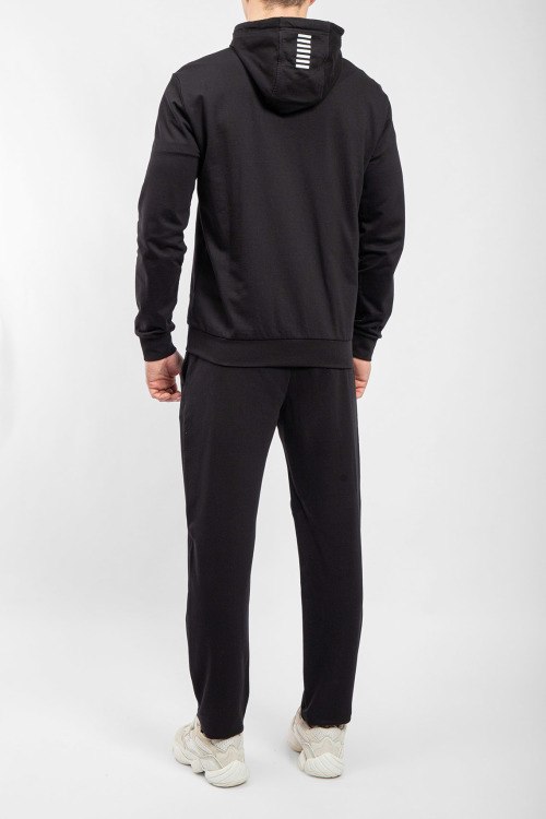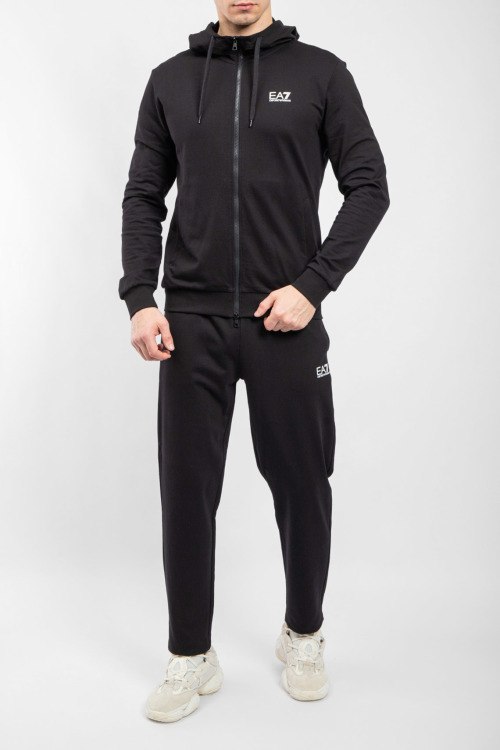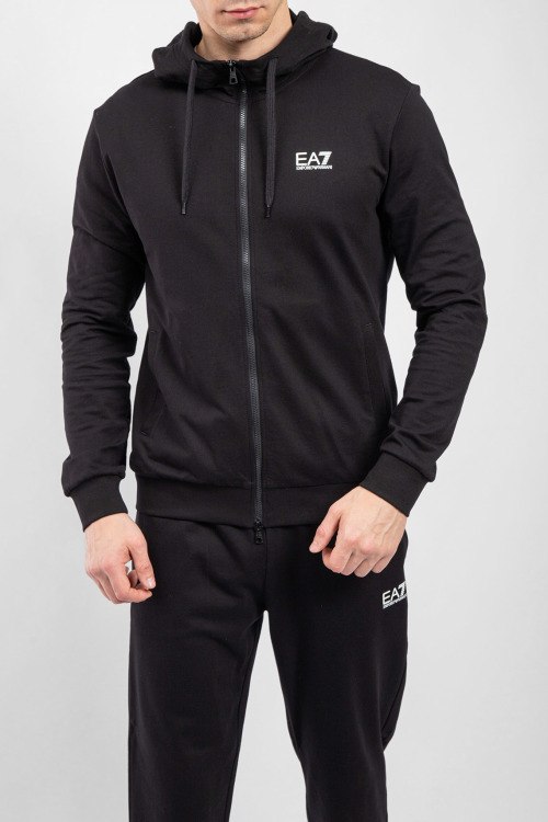 Мужской черный спортивный костюм из хлопка от EA7 Emporio Armani (ЕА7 Эмпорио Армани). Кофта с капюшоном, застежка на молнию, прорезные карманы, логотип бренда, спортивные брюки прямого кроя, эластичная резинка на поясе с кулиской, боковые карманы, логотип бренда.