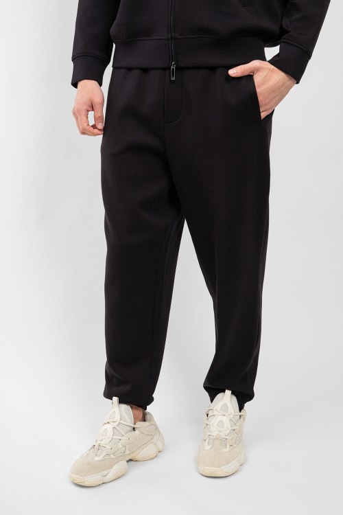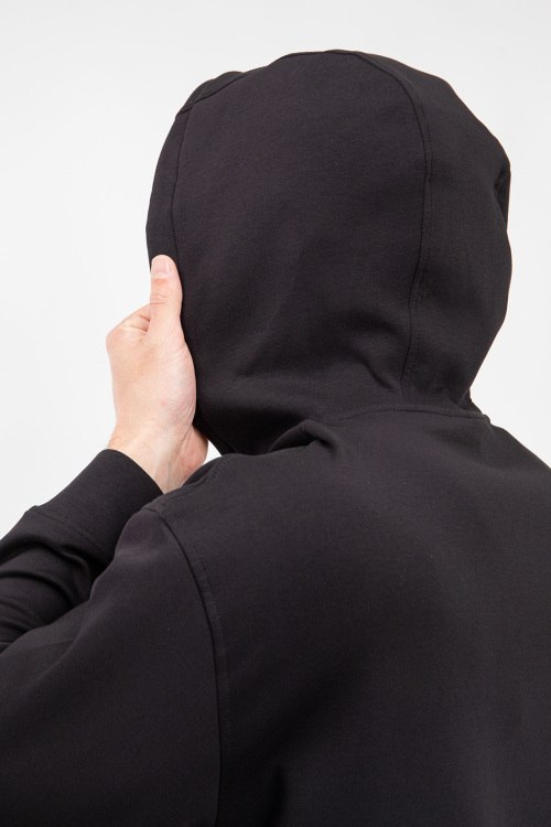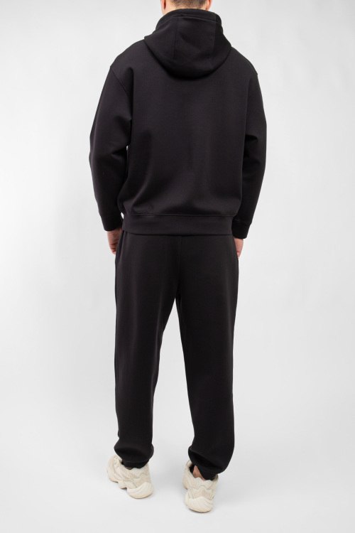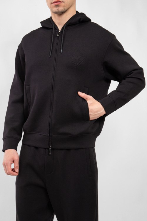 Мужской черный хлопковый спортивный костюм от Emporio Armani (Эмпорио Армани). Кофта: капюшон на завязках, вышитый логотип на груди, боковые карманы, застежка-молния, классическая длина, трикотажные манжеты и нижний край. Брюки: эластичный пояс на завязках, боковые карманы, манжеты на резинке, полная длина.