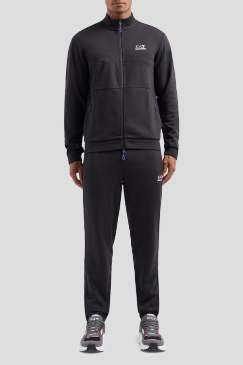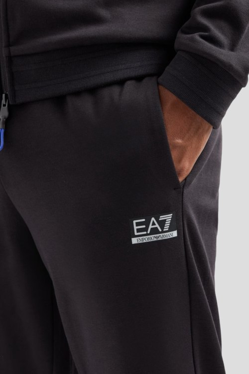 Детали: Мужской черный спортивный костюм Dynamic Athlete из технической ткани Ventus7 от EA7 Emporio Armani (ЕА7 Эмпорио Армани). Кофта: логотип на груди, высокий воротник, боковые карманы, застежка-молния, классическая длина, трикотажные манжеты и нижний край. Брюки: эластичный пояс, принт с логотипом, боковые карманы, полная длина