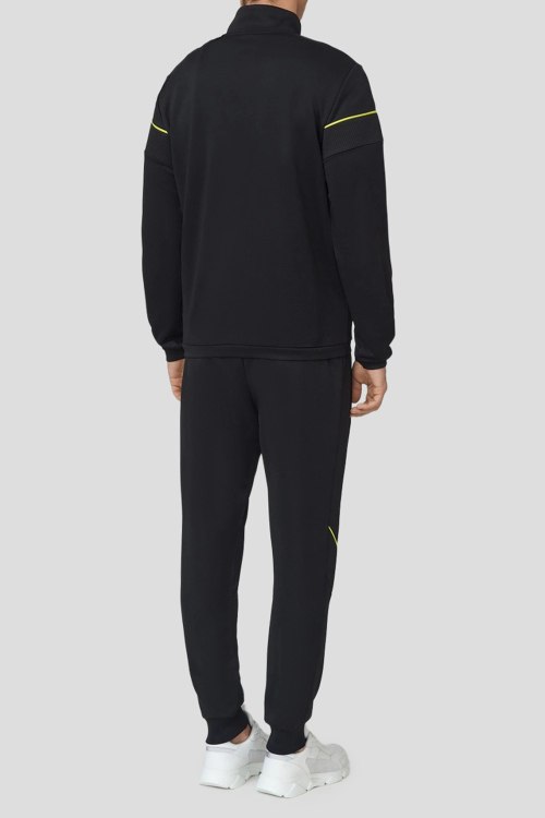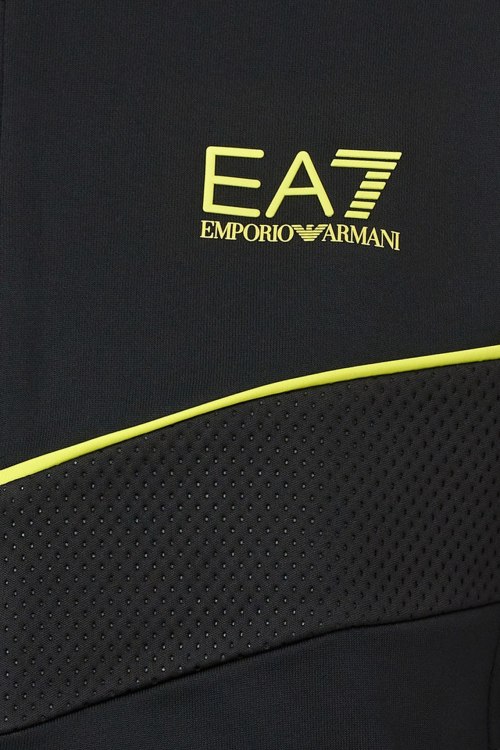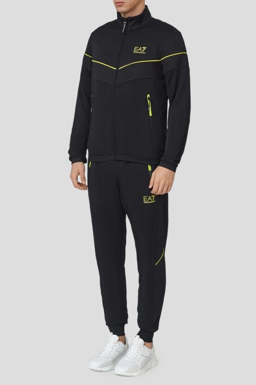 Детали: Мужской черный спортивный костюм от EA7 Emporio Armani (ЕА7 Эмпорио Армани). Кофта: логотип на груди, высокий воротник, боковые карманы на молнии, застежка-молния, классическая длина. Брюки: эластичный пояс, принт логотипа, боковые карманы на молнии, трикотажные манжеты, полная длина