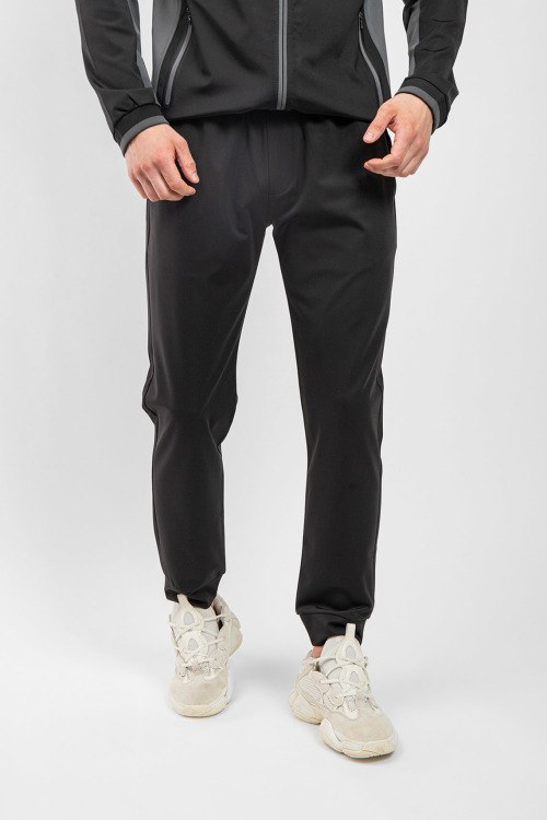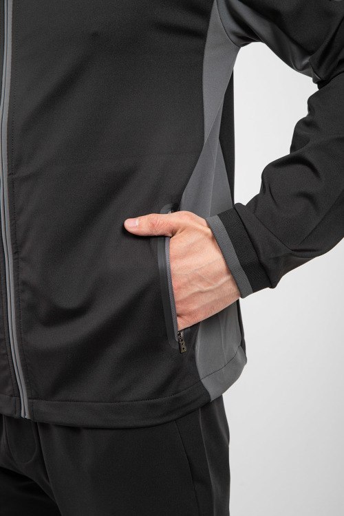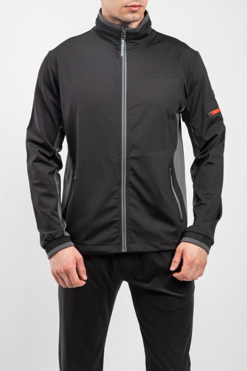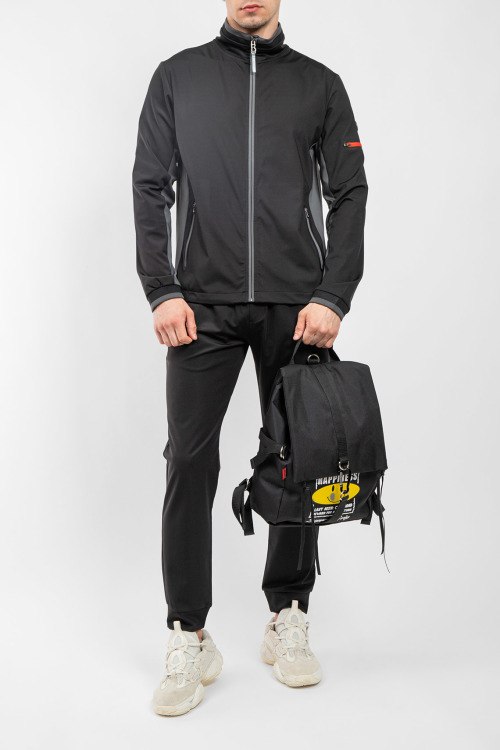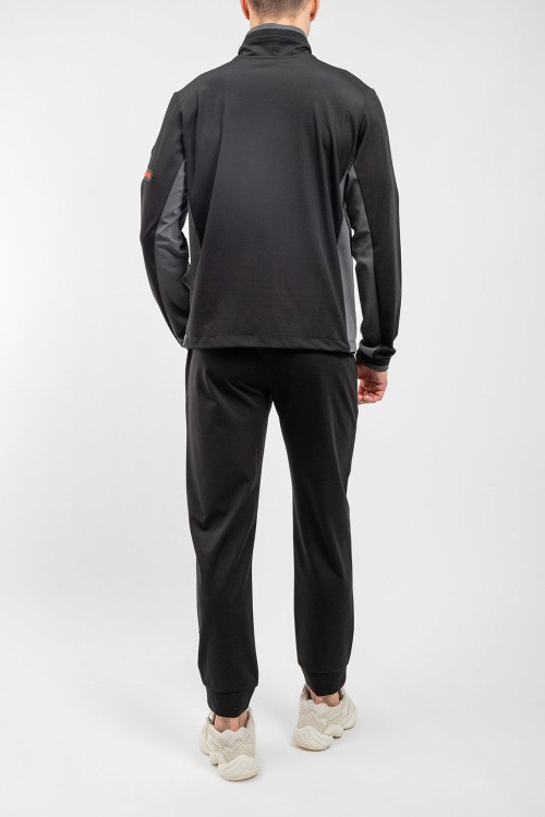 Детали: Мужской черный спортивный костюм из полиэстера от Bogner (Богнер). Спортивная кофта на молнии, высокий воротник-стойка, контрастные вставки, прорезные карманы на молнии, патч-лого на рукаве, спортивные брюки классической длины, эластичная резинка на поясе, прорезные карманы