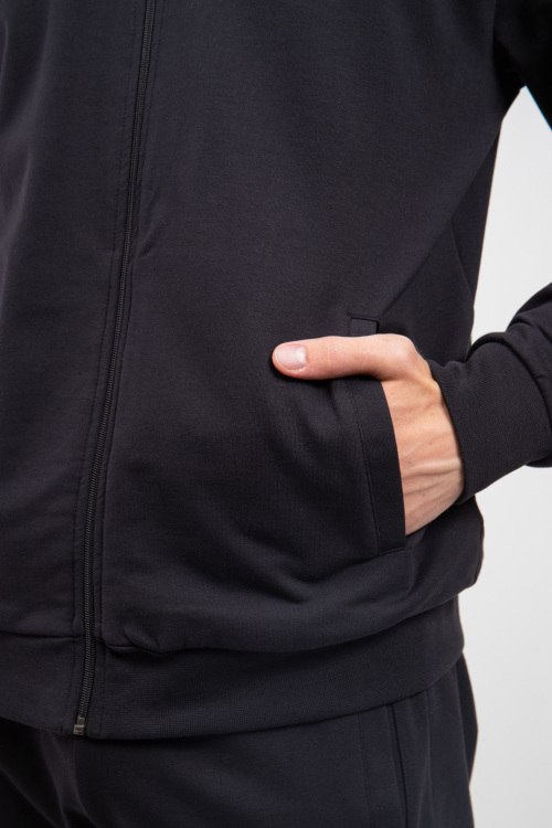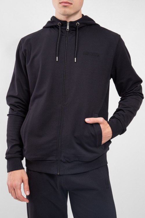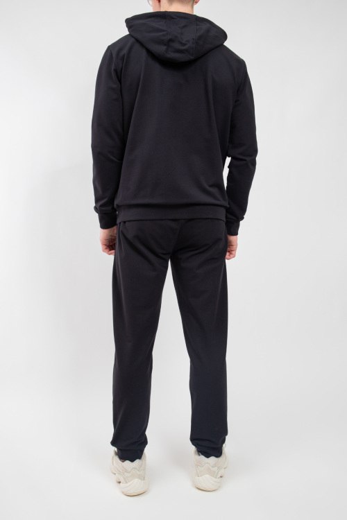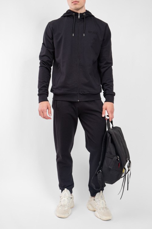 Детали: Мужской черный хлопковый спортивный костюм от Bikkembergs (Биккембергс). Кофта: логотип на груди, капюшон на завязках, боковые карманы, застежка-молния, классическая длина, трикотажные манжеты и нижний край. Брюки: эластичный пояс на завязках, боковые карманы, трикотажные манжеты, полная длина