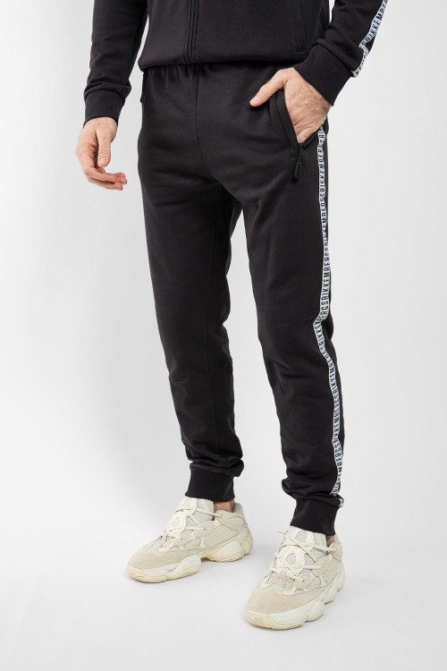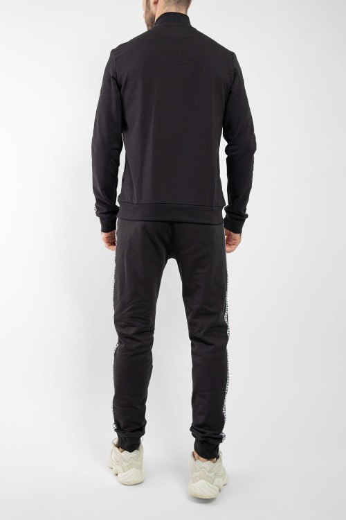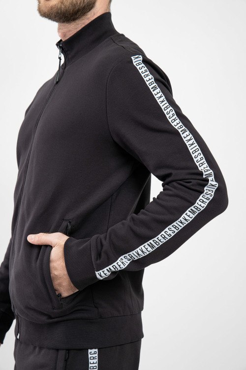 Мужской черный спортивный костюм из хлопкового микса от Bikkembergs (Биккембергс). Спортивная кофта на молнии, высокий воротник-стойка, длинные рукава с брендированными лампасами, трикотажная резинка на манжетах и по низу изделия, прорезные карманы, спортивные брюки с манжетами, эластичная резинка на поясе с кулиской.