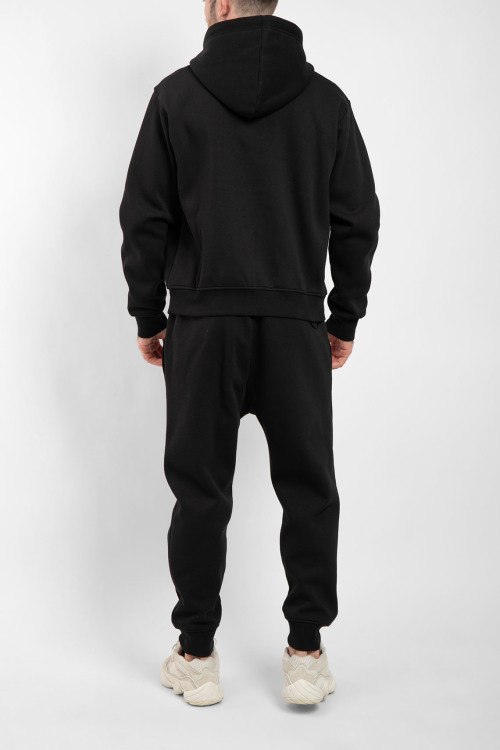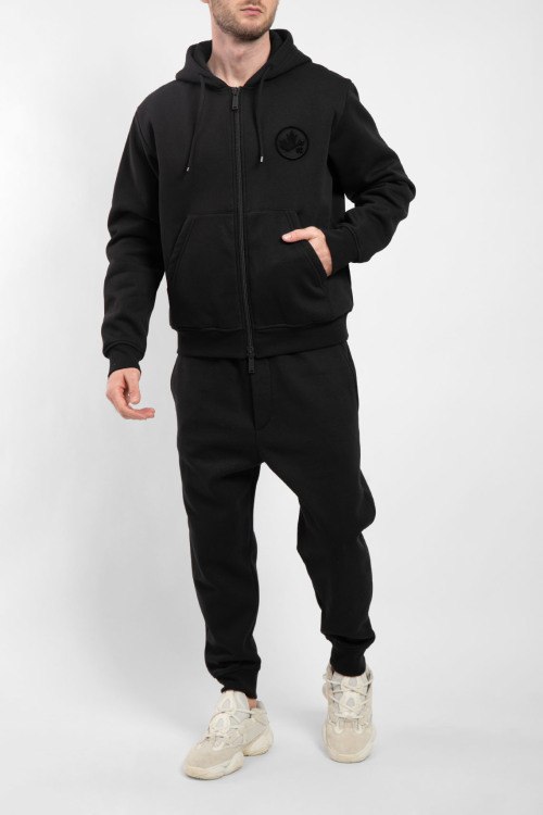 Мужской черный хлопковый спортивный костюм DSQ2 от Dsquared2 (Дискваред). Кофта: капюшон на завязках, нашивка на груди, боковые карманы, застежка-молния, классическая длина, трикотажные манжеты и нижний край. Брюки: эластичный пояс, нашивка с логотипом сзади, боковые карманы, трикотажные манжеты, полная длина.