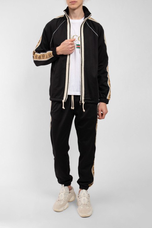 Мужской черный спортивный костюм из хлопкового микса от Gucci (Гуччи). Спортивная кофта на молнии, высокий воротник-стойка, длинные рукава реглан с брендированными лампасами вдоль, трикотажная резинка на манжетах, прорезные карманы. Брюки классической длины, трикотажная резинка на манжетах, эластичная резинка на поясе с кулиской, прорезные карманы, лампасы.