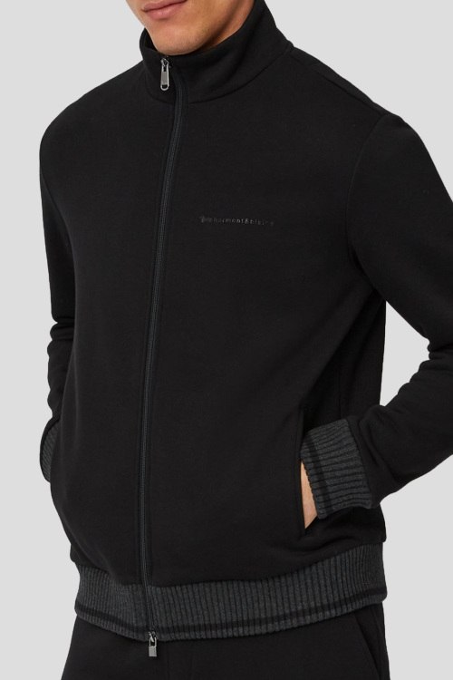Детали: Мужской черный спортивный костюм из хлопкового микса от Harmont & Blaine (Хармонт энд Блейн). Спортивная кофта на молнии, высокий воротник-стойка, длинные рукава, логотип бренда на груди, прорезные карманы, трикотажная резинка на манжетах и по низу изделия, спортивные брюки с прорезными карманами, эластичная резинка на поясе