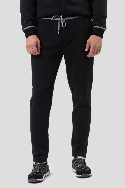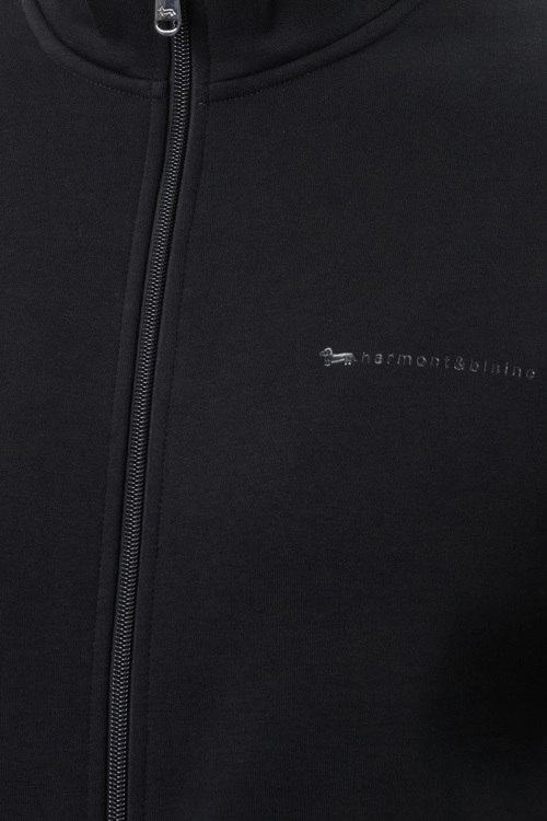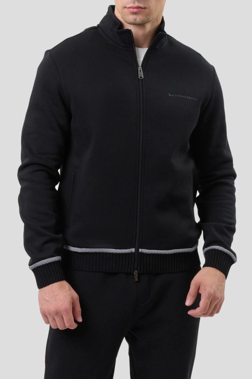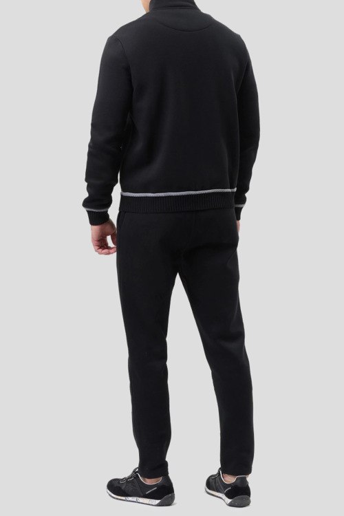 Детали: Мужской черный хлопковый спортивный костюм от Harmont & Blaine (Хармонт энд Блейн). Кофта: логотип на груди, высокий воротник, боковые карманы, застежка-молния, классическая длина, трикотажные манжеты и нижний край. Брюки: эластичный пояс на завязках, боковые карманы, низ без манжетов, полная длина