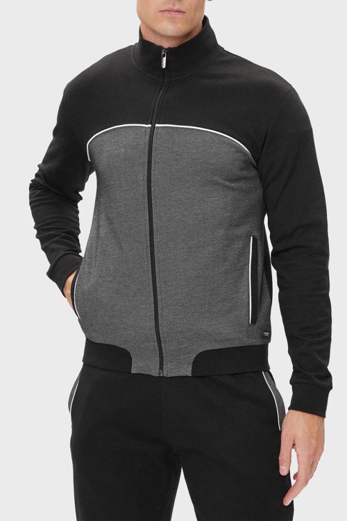 Детали: Мужской черный спортвиный костюм из хлопкового микса от Hugo Boss (Хуго Босс). Кофна на молнии, воротник-стойка, патч-лого, боковые карманы, спортивные брюки с манжетами, эластичная резинка на поясе, прорезные карманы