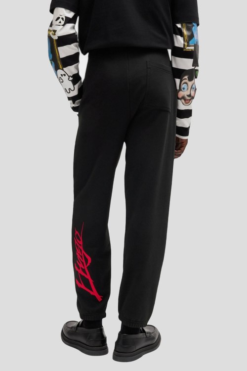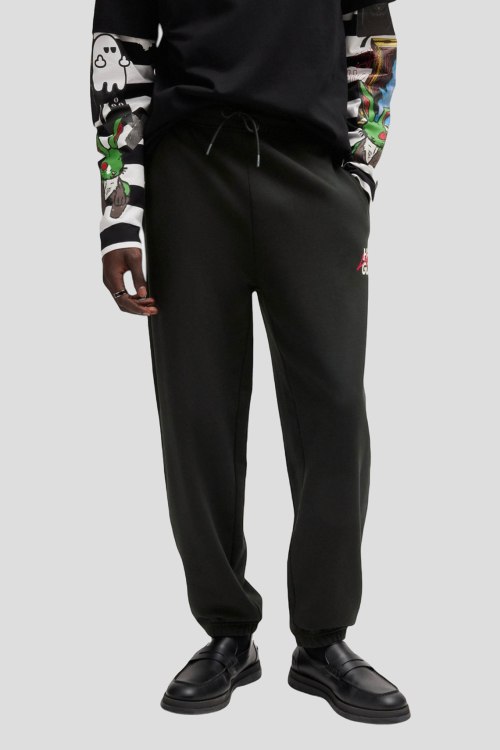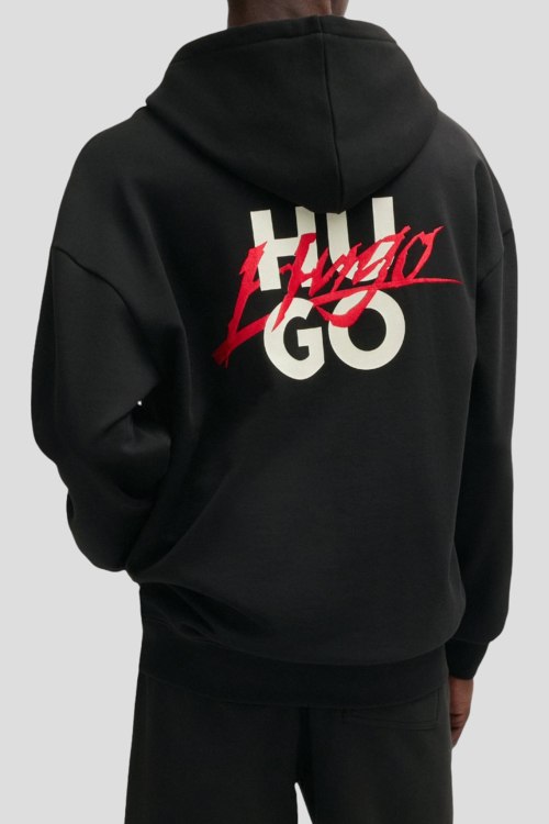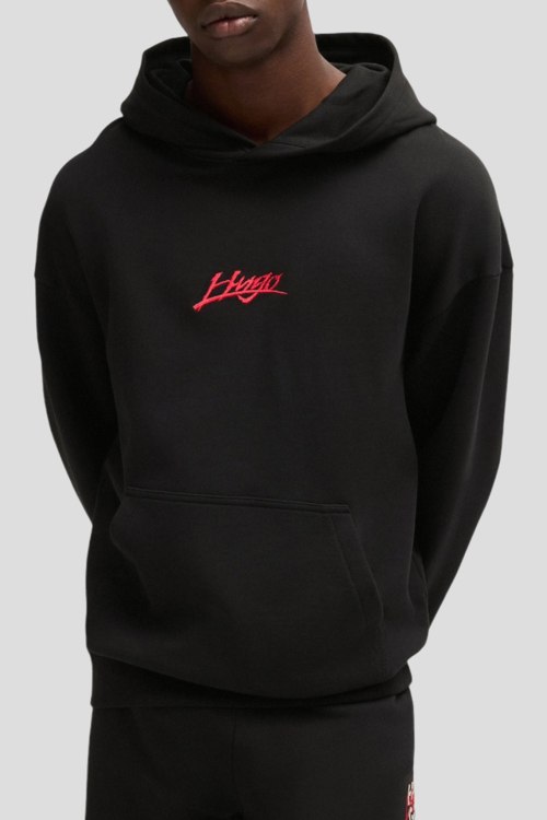 Детали: Мужской черный хлопковый спортивный костюм Dlogolong от Hugo by Hugo Boss (Хуго бай Хуго Босс). Худи: вшитый капюшон, логотип на груди и на спине, карман-кенгуру, классическая длина, трикотажные манжеты и нижний край. Брюки: эластичный пояс на завзках, боковые карманы, принт с логотипом, манжеты на резинке, полная длина