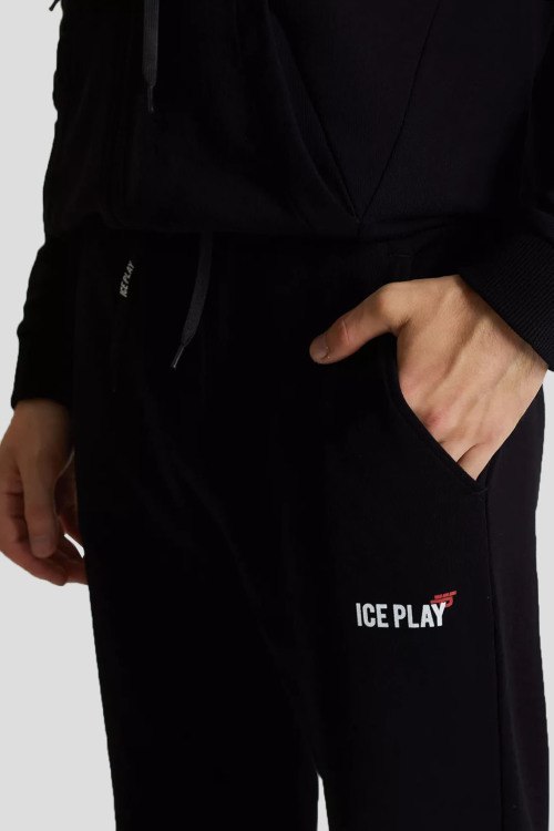 Детали: Мужской черный спортивный костюм из хлопка от Ice Play (Айс Плей). Спортивная кофта на молнии, вшитый капюшон, боковые карманы, спортивные брюки с манжетами, прорезыне карманы, эластичная резинка на поясе, логотип бренда