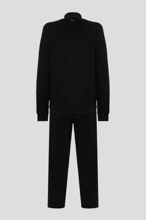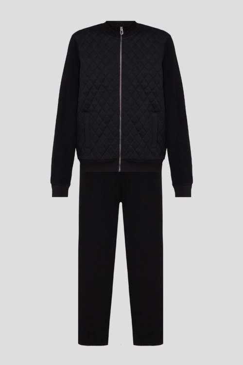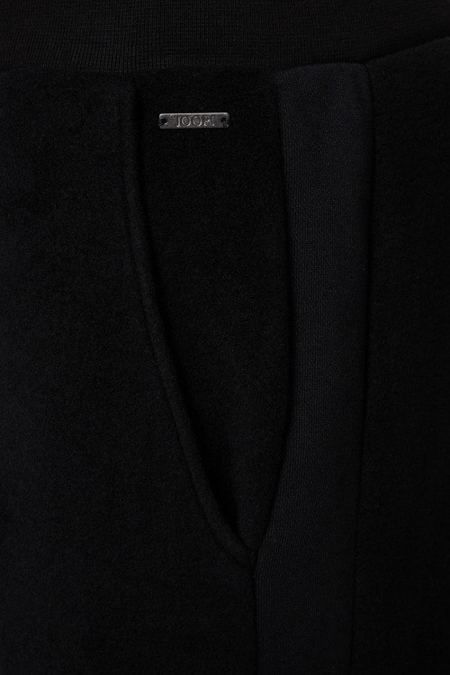 Детали: Мужской черный спортивный костюм из модала и хлопка от Joop! (Йооп!). Кофта: стеганая вставка, воротник-стойка, боковые карманы, застежка-молния, трикотажные манжеты и нижний край. Длина рукава: длинный, для размера L - 77 см, обхват груди: для размера L - 118 см, обхват талии: для размера L - 112 см, длина изделия по среднему шву спинки от горловины: для размера L - 73 см. Брюки: эластичный пояс на завязках, боковые карманы, низ без манжетов. Обхват пояса: для размера L - 92 см, обхват бедер: для размера L - 112 см, длина штанины: для размера L - 100 см, длина по шаговому шву: для размера L - 75 см