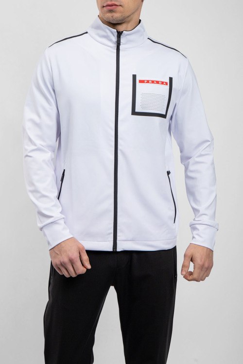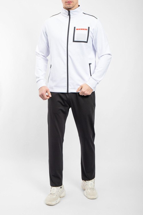 Детали: Мужской черно-белый спортивный костюм от Prada (Прада). Кофта: высокий воротник, логотип на груди, боковые карманы на молнии, застежка-молния, классическая длина, трикотажные манжеты. Брюки: эластичный пояс на завязках, боковые карманы, низ без манжетов, полная длина