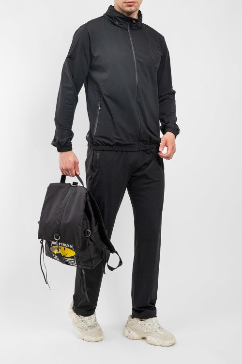 Мужской черный спортивный костюм из хлопкового микса от Moncler (Монклер). Спортивная кофта на молнии, воротник-стойка, скрытый капюшон, боковые карманы на молнии, патч-лого. спортивные брюки прямого кроя, эластичная резинка на поясе с кулиской.