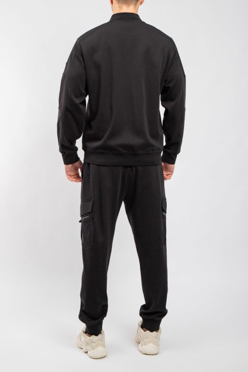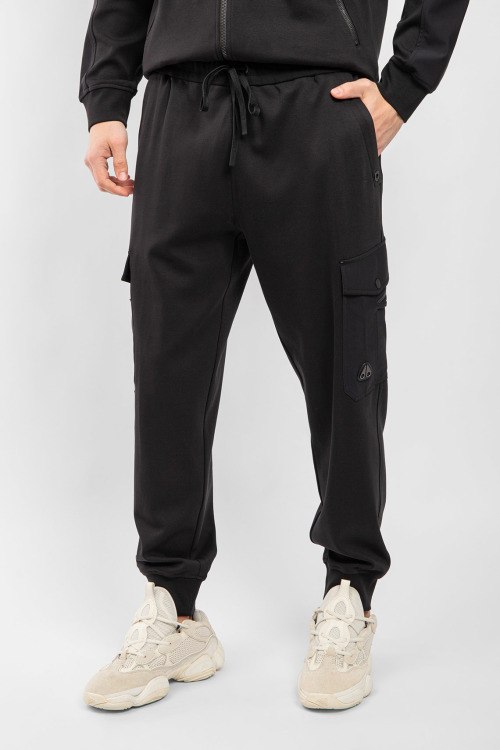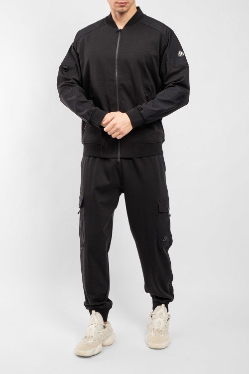 Детали: Мужской черный хлопковый спортивный костюм от Moose Knuckles (Мус Наклс). Кофта: воротник-стойка, логотип на рукаве, боковые карманы на молнии, застежка-молния, классическая длина, трикотажные манжеты и нижний край. Брюки: эластичный пояс на завязках, боковые карманы, накладные карманы-карго, трикотажные манжеты, полная длина. Размер вещи на фото: L