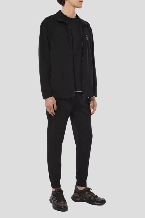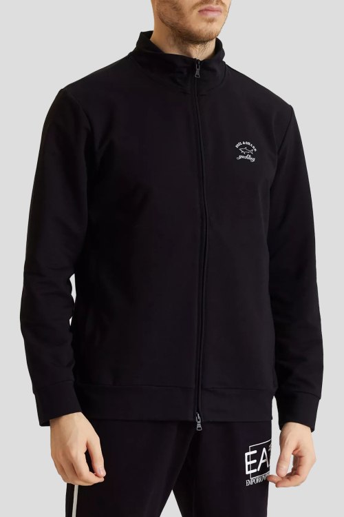 Детали: Мужской черный хлопковый спортивный костюм от Paul & Shark (Пол энд Шарк). Кофта: принт с логотипом на груди, высокий воротник, боковые карманы, застежка-молния, классическая длина. Брюки: эластичный пояс на завязках, боковые карманы, трикотажные манжеты, полная длина