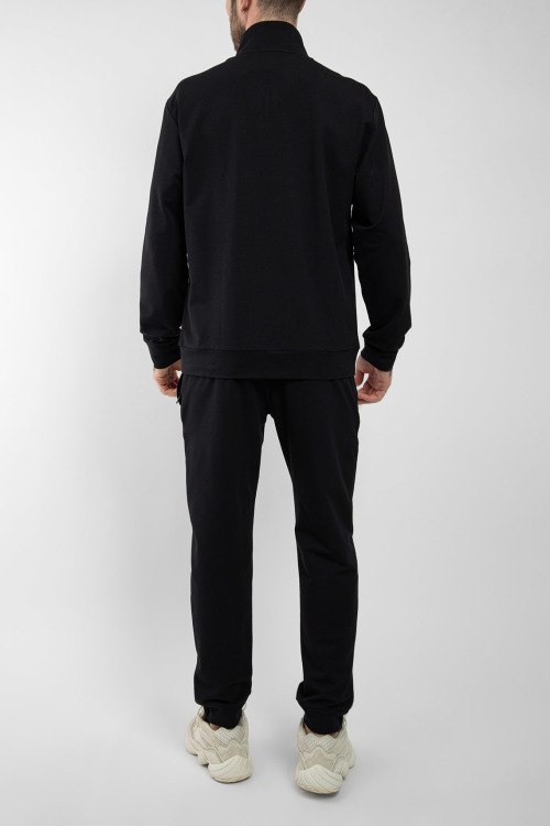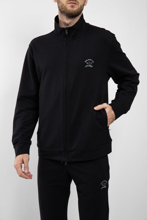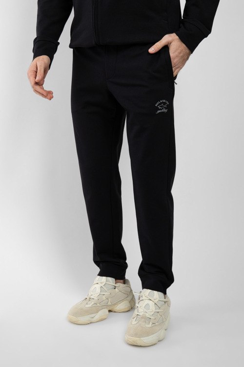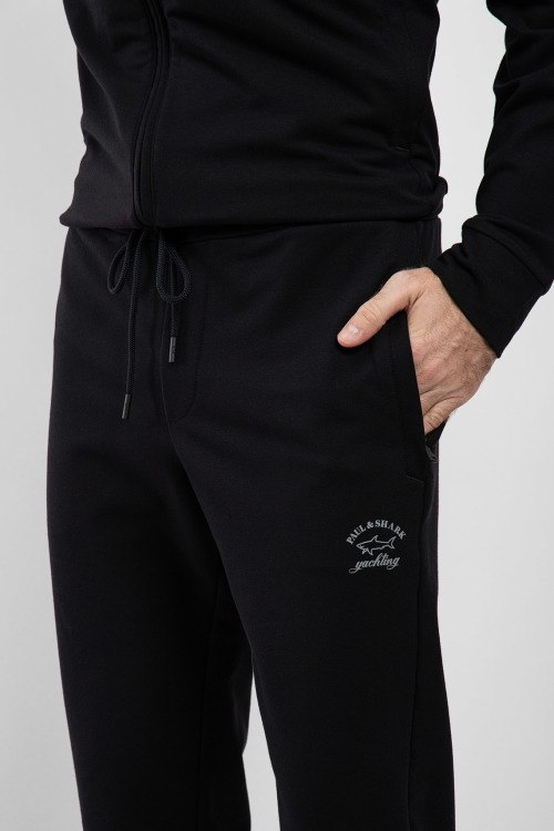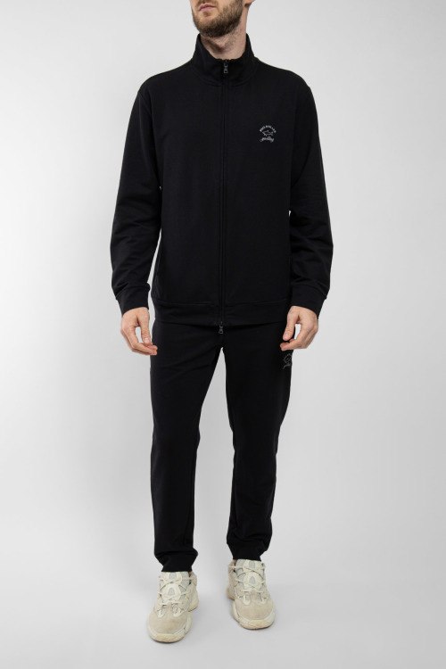 Мужской черный спортивный костюм из хлопкового микса от Paul & Shark (Пол энд Шарк). Спортивная кофта на молнии, высокий воротник-стойка, длинные рукава, прорезные карманы, спортивные брюки с эластичной резинкой на поясе, прорезные карманы, патч-лого.