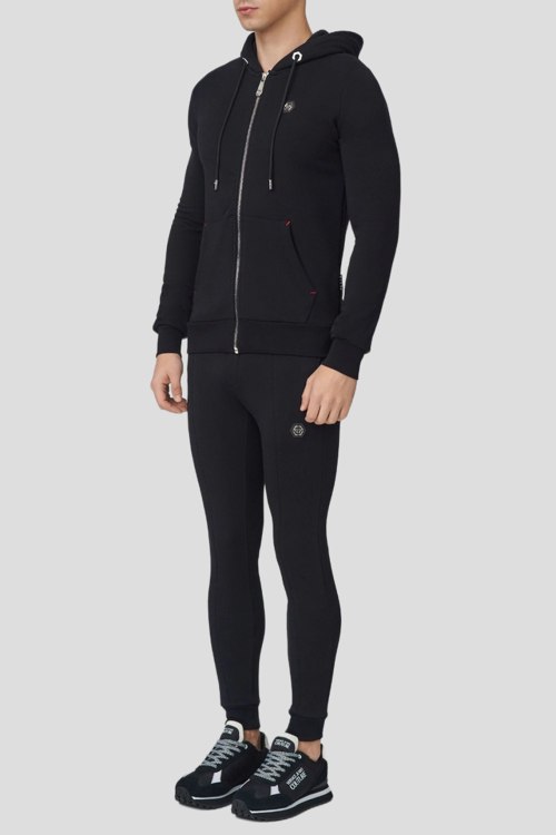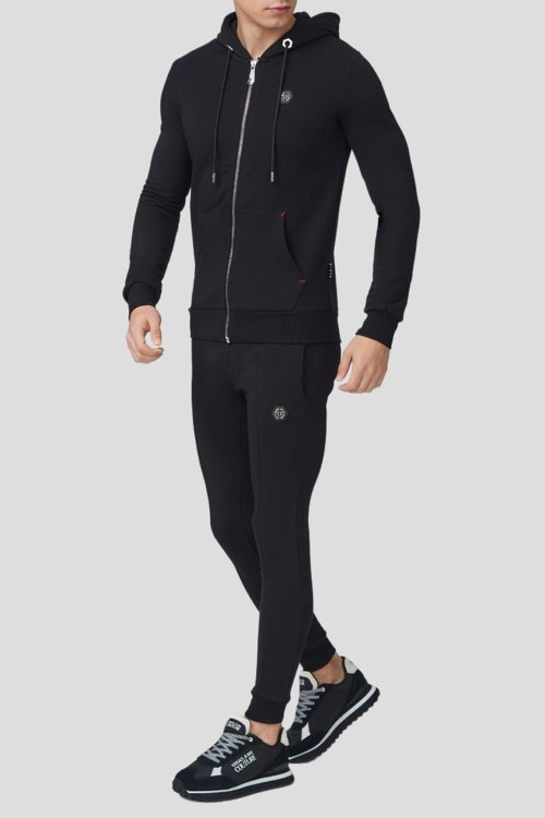 Детали: Мужской черный хлопковый спортивный костюм от Philipp Plein (Филипп Плейн). Кофта: капюшон на завязках, логотип на груди, боковые карманы, застежка-молния, классическая длина, трикотажные манжеты и нижний край. Брюки: эластичный пояс, нашивка с логотипом, боковые карманы, трикотажные манжеты, полная длина