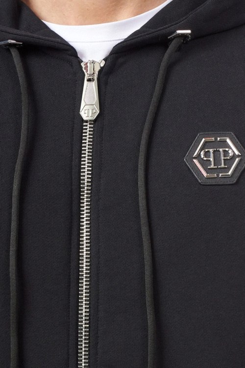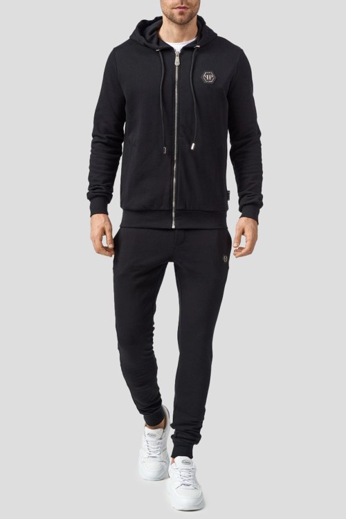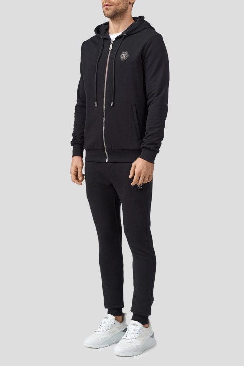 Детали: Мужской черный хлопковый спортивный костюм от Philipp Plein (Филипп Плейн). Кофта: капюшон на завязках, логотип на груди и на спине, боковые карманы, застежка-молния, классическая длина, трикотажные манжеты и нижний край. Брюки: эластичный пояс, боковые карманы, нашивка с логотипом, принт сзади, трикотажные манжеты, полная длина