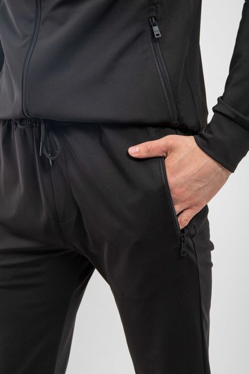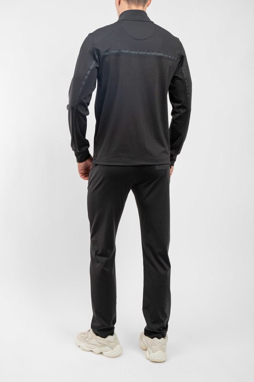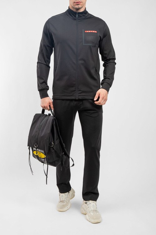 Детали: Мужской черный спортивный костюм из полиэстера от Prada (Прада). Спортивная кофта на молнии, воротник-стойка, длинные рукава, брендированный принт на груди, боковые карманы на молнии, трикотажная резинка на манжетах и по низу изделия, Спортивные брюки прямого кроя, эластичная резинка на поясе с кулиской, прорезные карманы на молнии, логотип бренда