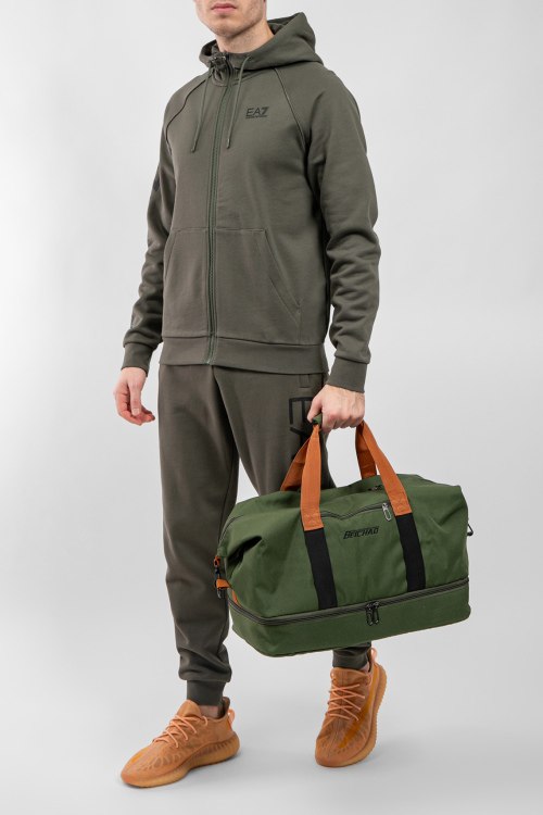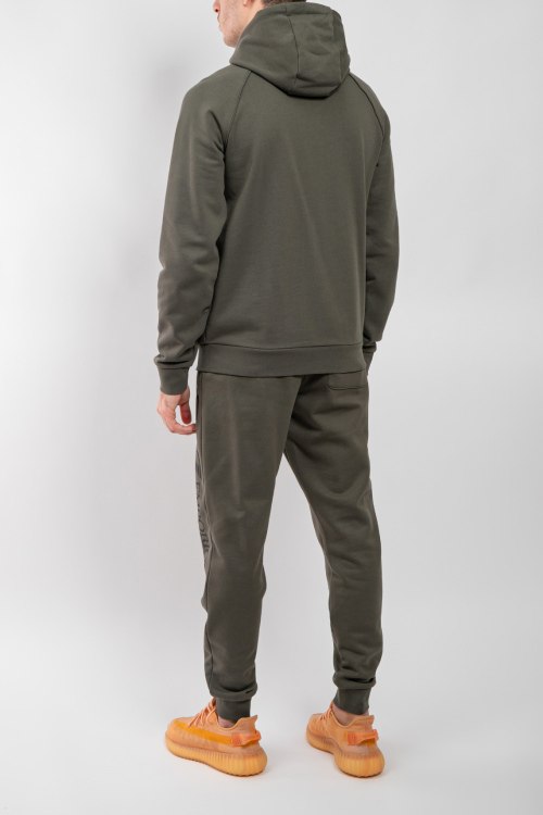 Мужской хлопковый спортивный костюм цвета хаки от EA7 Emporio Armani (ЕА7 Эмпорио Армани). Кофта: капюшон на завязках, логотип на груди, боковые карманы, застежка-молния, классическая длина, трикотажные манжеты и нижний край. Брюки: эластичный пояс, принт с логотипом, боковые карманы, один карман сзади, трикотажные манжеты, полная длина.