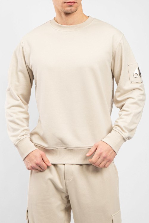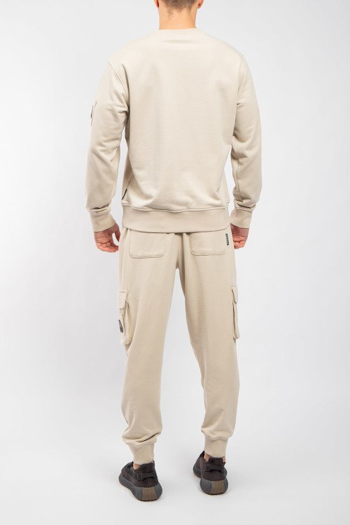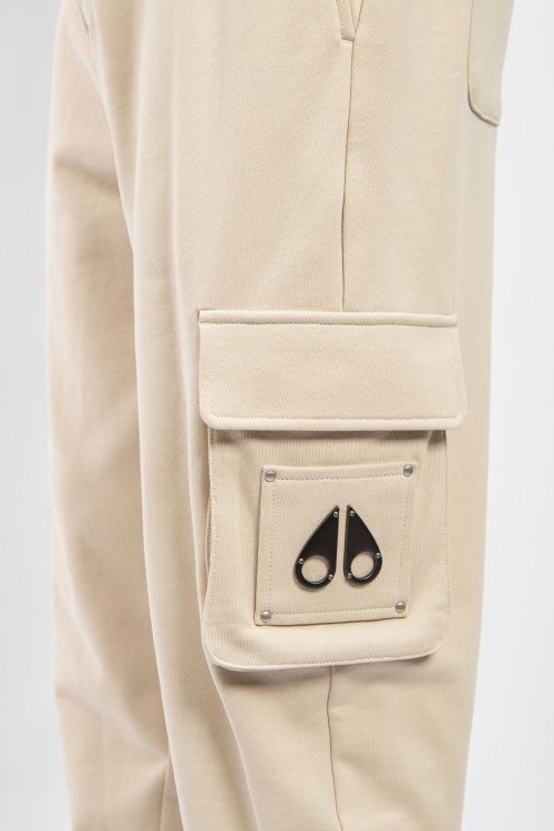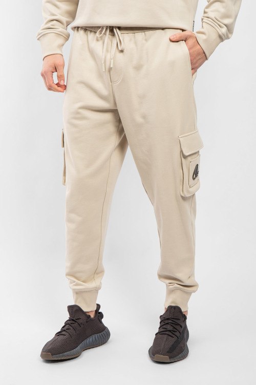 Детали: Мужской кремовый хлопковый спортивный костюм от Moose Knuckles (Мус Наклс). Свитшот: логотип на рукаве, круглый вырез горловины, классическая длина, трикотажные манжеты и нижний край. Брюки: эластичный пояс, боковые карманы, накладные карманы-карго, трикотажные манжеты, полная длина. Размер вещи на фото: L