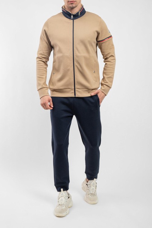 Мужской бежево-синий хлопковый спортивный костюм от Moncler (Монклер). Кофта: высокий воротник со скрытым капюшоном, логотип на рукаве, боковые карманы на кнопке, застежка-молния, классическая длина, трикотажные манжеты и нижний край. Брюки: эластичный пояс на завязках, боковые карманы, нашивка с логотипом сзади, трикотажные манжеты, полная длина.