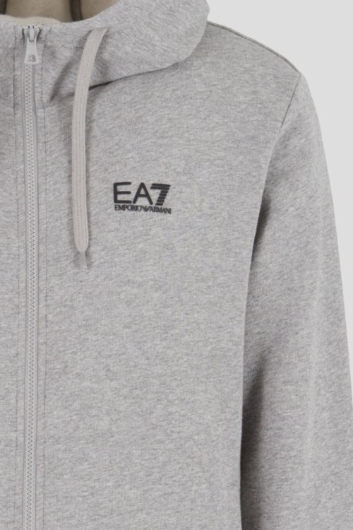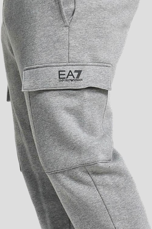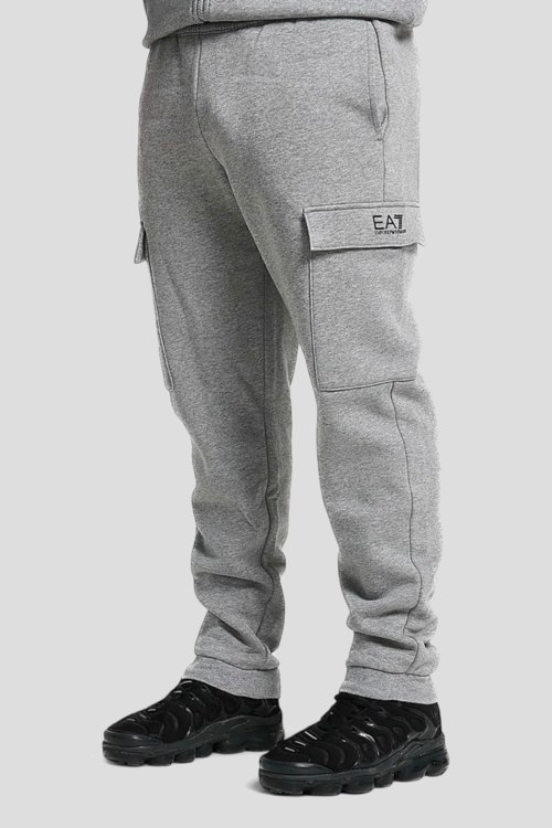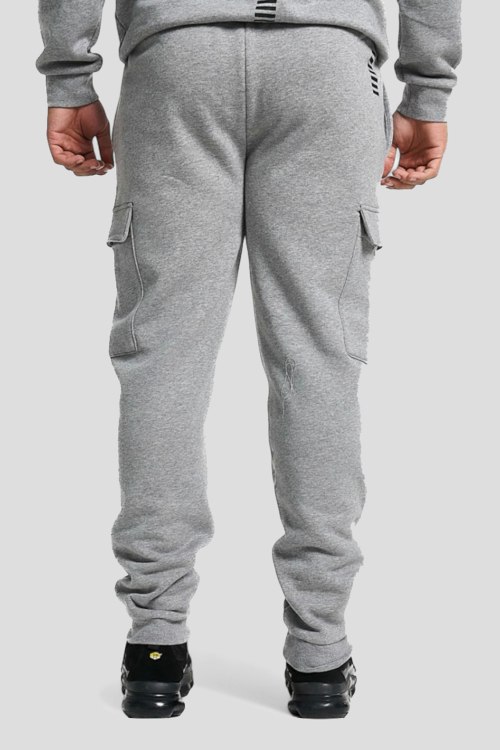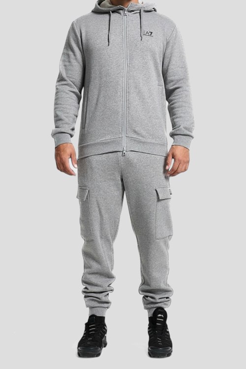 Детали: Мужской серый хлопковый спортивный костюм Felpa Train Core Identity от EA7 Emporio Armani (ЕА7 Эмпорио Армани). Кофта: логотип на груди, капюшон на завязках, боковые карманы, застежка-молния, классическая длина, трикотажные манжеты и нижний край. Брюки: эластичный пояс, принт с логотипом, боковые карманы, накладные карманы-карго, трикотажные манжеты, полная длина
