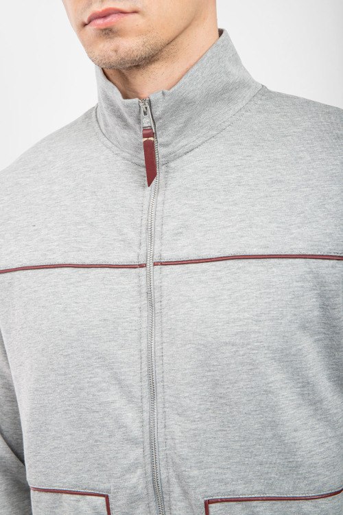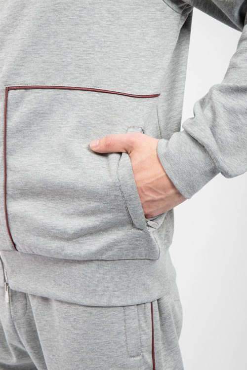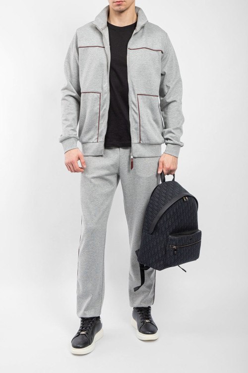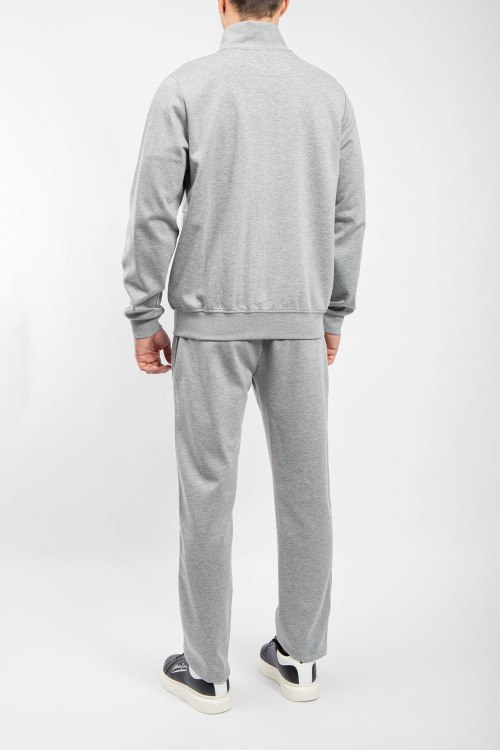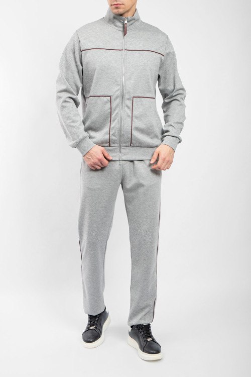 Мужской светло-серый хлопковый спортивный костюм от Brunello Cucinelli (Брунелло Кучинелли). Кофта: высокий воротник, боковые карманы, застежка-молния, классическая длина, трикотажные манжеты и нижний край. Брюки: эластичный пояс на завязках, боковые карманы, низ без манжетов, полная длина.