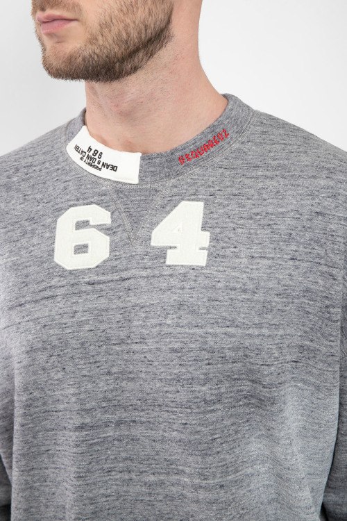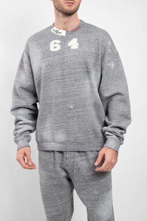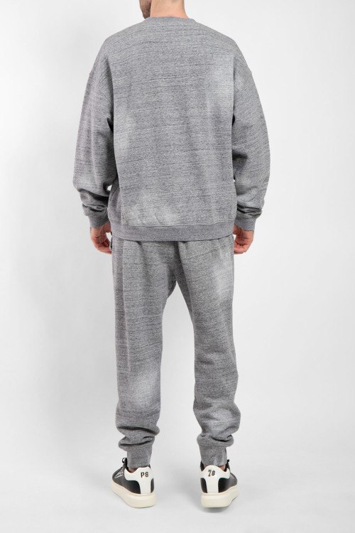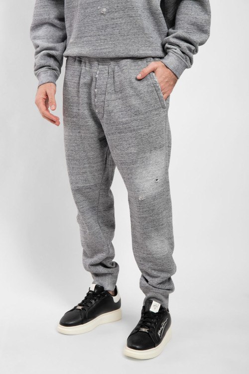 Мужской серый хлопковый спортивный костюм DSQ2 от Dsquared2 (Дискваред). Свитшот: дизайн с потертостями, круглый вырез горловины, нашивка на груди, классическая длина, трикотажные манжеты и нижний край. Брюки: эластичный пояс, дизайн с потертостями, нашивка с логотипом сзади, боковые карманы, трикотажные манжеты на резинке, полная длина.