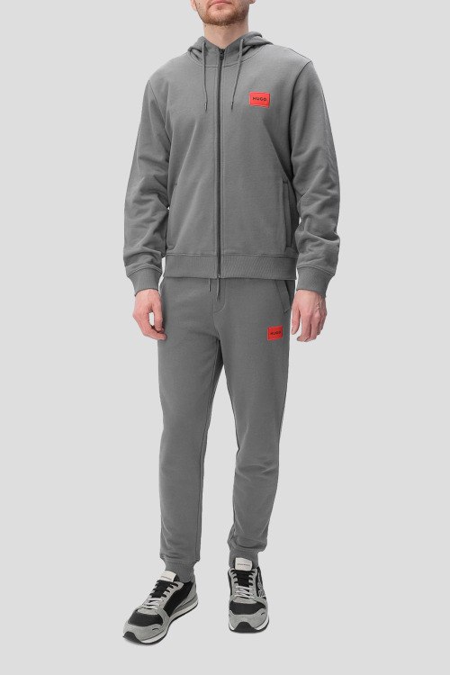 Детали: Мужской серый спортивный костюм Daple212 из хлопка от Hugo Boss (Хуго Босс). Спортивная кофта на молнии, вшитый капюшон, прорезные карманы, патч-лого, спортивные брюки с манжетами, прорезные карманы, контрастный патч-лого