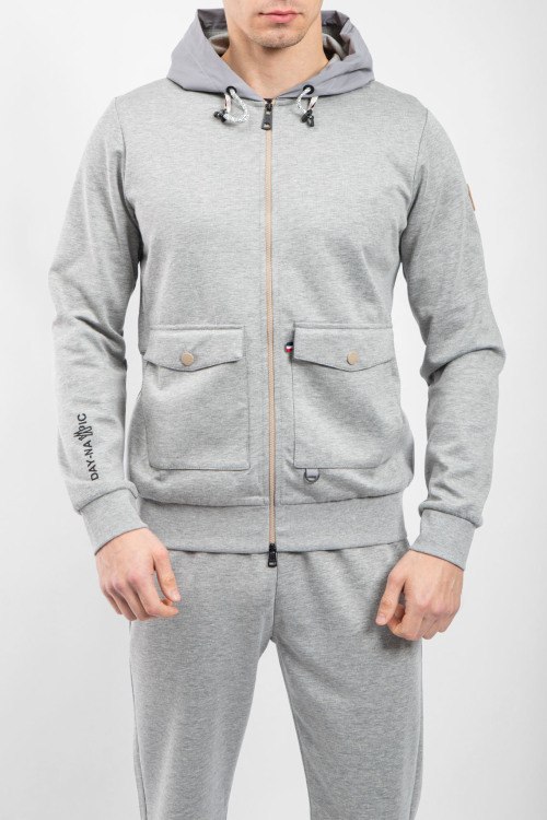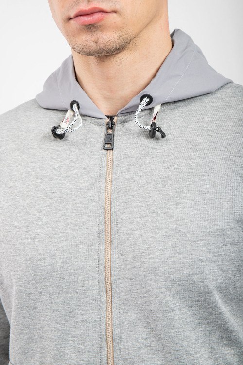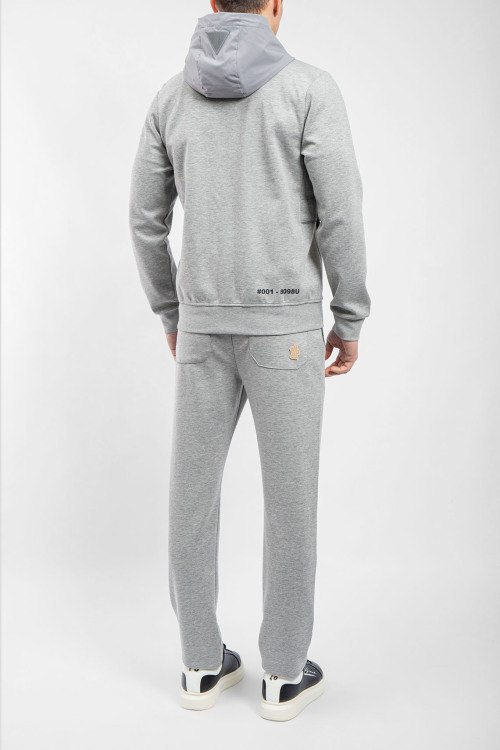 Детали: Мужской серый хлопковый спортивный костюм от Moncler (Монклер). Кофта: модель с капюшоном, нашивка с логотипом на рукаве, передние карманы, застежка-молния, классическая длина, трикотажные манжеты и нижний край. Брюки: эластичный пояс на завязках, боковые карманы, низ без манжетов, полная длина