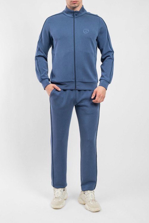 Детали: Мужской синий спортивный костюм из хлопкового микса от Armani (Армани). Кофта на молнии, воротник-стойка, длинные рукава, трикотажная резинка на манжетах и по низу изделия, прорезные карманы, вышитый логотип бренда на груди. Брюки прямого кроя, эластичная резинка на поясе, прорезные карманы