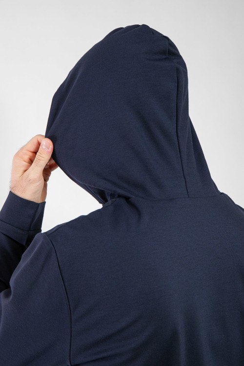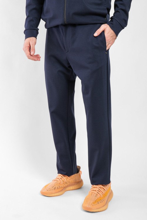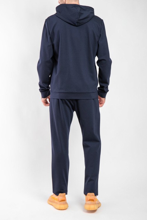 Мужской темно-синий спортивный костюм Russel из вискозного микса от Bogner (Богнер). Спортивная кофта на молнии, вшитый капюшон с кулиской, манжеты и низ изделия в рубчик, прорезные карманы, спортивные брюки классической длины, застежка на молнию и пуговицы, прорезные карманы.