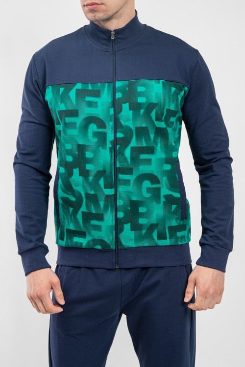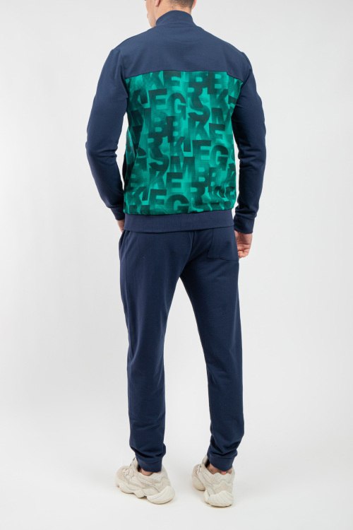 Мужской синий спортивный костюм из хлопкового микса от Bikkembergs (Биккембергс). Спортивная кофта на молнии, воротник-стойка, брендированная вставка, прорезные карманы, спортивные брюки с манжетами, прорезные карманы, эластичная резинка на поясе.