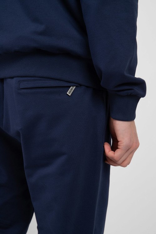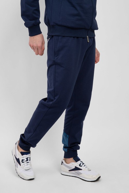 Мужской темно-синий спортивный костюм из хлопкового микса от Bikkembergs (Биккембергс). Спортивная кофта на молнии, воротник-стойка, длинные рукава, трикотажная резинка на манжетах и по низу изделия, прорезные карманы, брендированный принт, спортивные брюки с манжетами, эластичная резинка на поясе с кулиской, прорезные карманы.