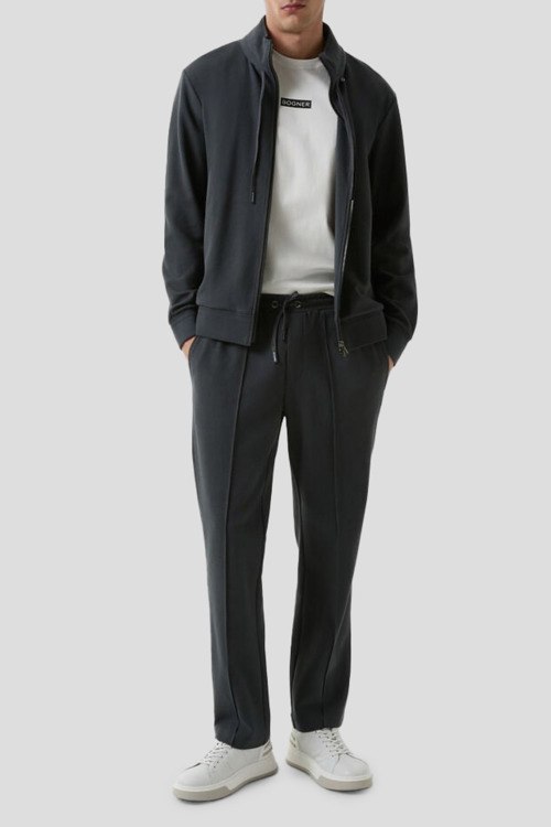 Детали: Мужские темно-серый спортивный костюм Edward из хлопка и модала от Bogner (Богнер). Спортивная кофта на молнии, воротник-стойка с кулиской, трикотажная резинка на манжетах и по низу изделия, брюки прямого кроя, кулиска на поясе, прорезные карманы