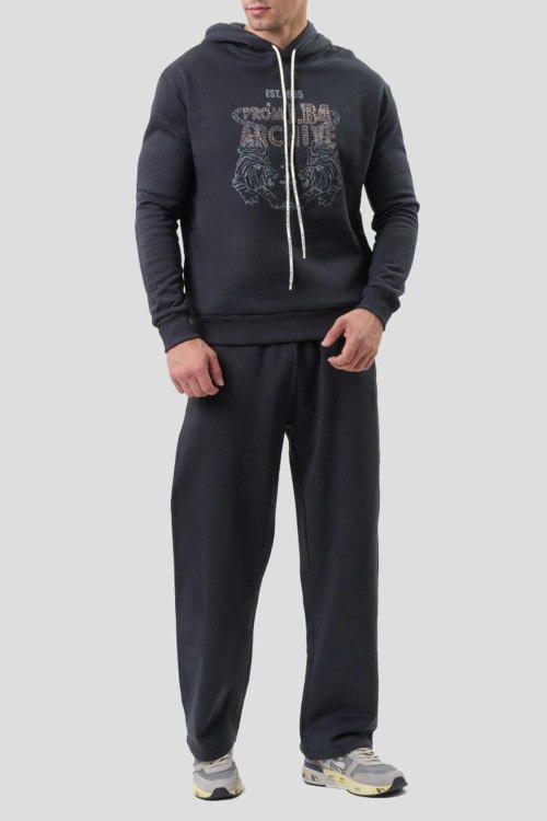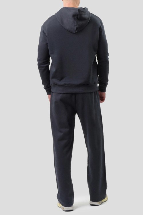 Детали: Мужской темно-серый хлопковый спортивный костюм от J.B4 Just Before (Джаст Бифо). Худи: принт и вышивка на груди, капюшон на завязках, классическая длина, трикотажные манжеты и нижний край. Брюки: эластичный пояс, боковые карманы, низ без манжетов, полная длина