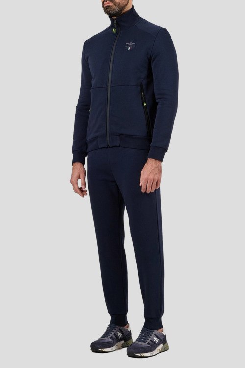 Детали: Мужской темно-синий хлопковый спортивный костюм от Aeronautica Militare (Аэронавтика Милитари). Кофта: логотип на груди, высокий воротник, боковые карманы на молнии, застежка-молния, классическая длина, трикотажные манжеты и нижний край. Брюки: эластичный пояс на завязках, боковые карманы, трикотажные манжеты, полная длина. Параметры модели: 108-83-99, рост 189 см. На модели надет: L размер
