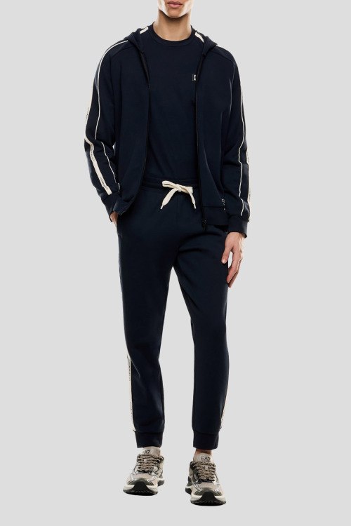 Детали: Мужской темно-синий хлопковый спортивный костюм от EA7 Emporio Armani (ЕА7 Эмпорио Армани). Кофта: брендированные лампасы, вшитый капюшон, боковые карманы, застежка-молния, классическая длина, трикотажные манжеты и нижний край. Брюки: эластичный пояс на завязках, боковые карманы, брендированные лампасы, трикотажные манжеты, полная длина