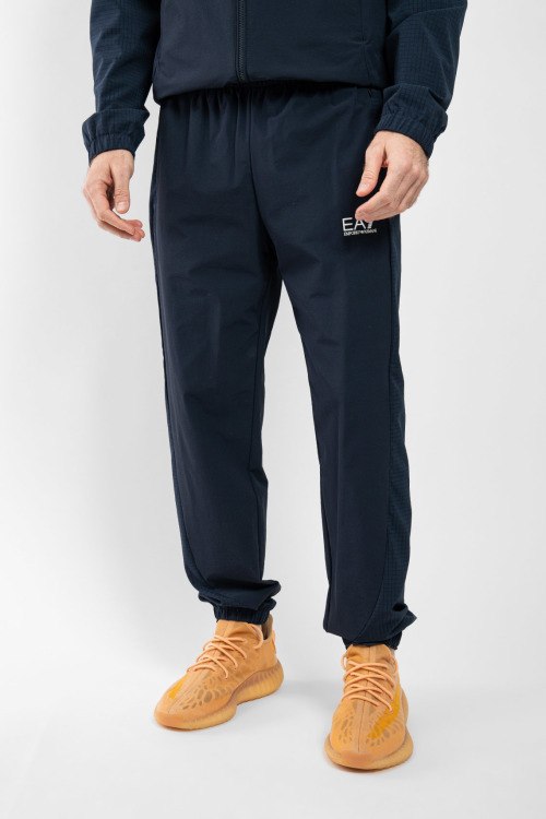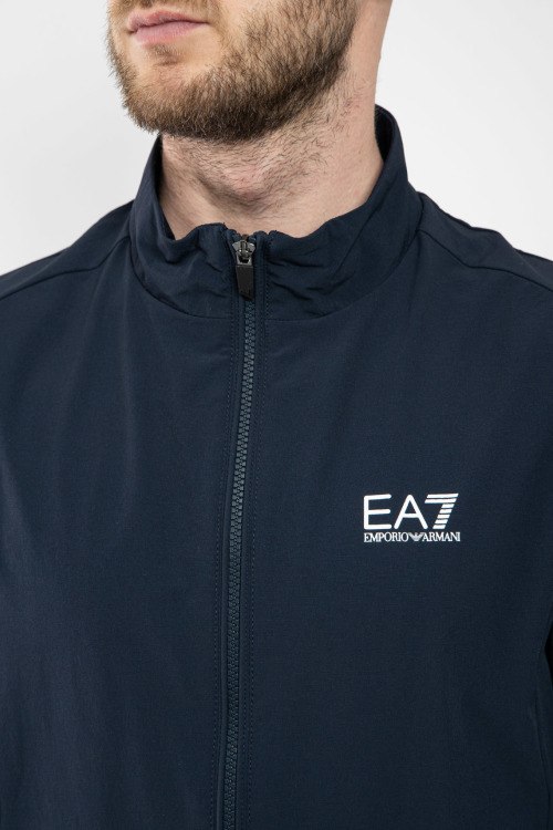 Мужская темно-синяя спортивный костюм из полиамида и эластана от Armani (Армани). Кофта на молнии, воротник-стойка, трикотажная резинка на манжетах и по низу изделия, прорезные карманы, брюки с манжетами, эластичная резинка на поясе, прорезные карманы, логотип бренда.