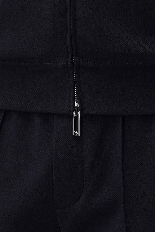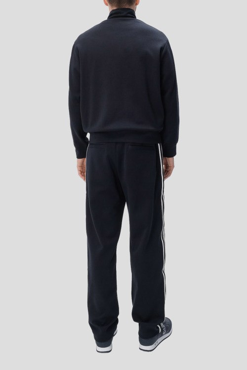 Детали: Мужской темно-синий спортивный костюм из хлопка и модала от Emporio Armani (Эмпорио Армани). Дизайн с лампасами, спортивная кофта на молнии, высокий воротник-стойка, манжета и низ изделия на трикотажной резинке, прорезные карманы, спортивные брюки прямого кроя, эластичная резинка на поясе, прорезные карманы