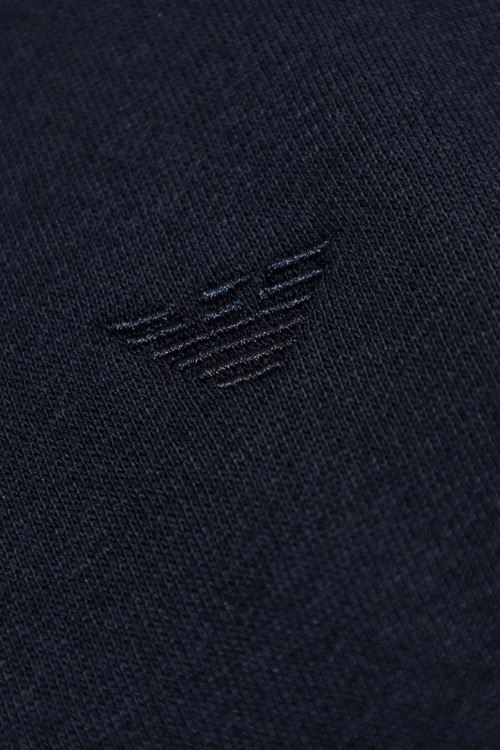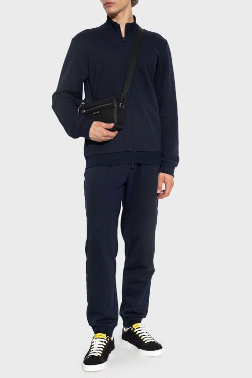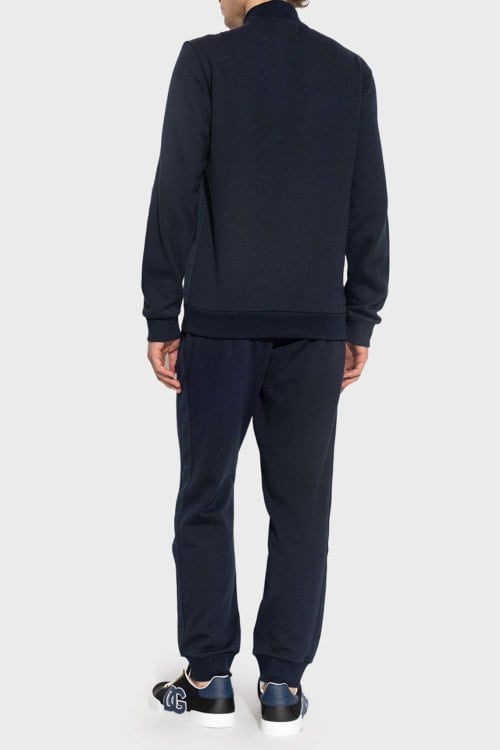 Детали: Мужской темно-синий хлопковый спортивный костюм от Emporio Armani (Эмпорио Армани). Кофта: логотип на груди, высокий воротник, боковые карманы, застежка-молния, классическая длина, трикотажные манжеты и нижний край. Брюки: эластичный пояс, боковые карманы, трикотажные манжеты, полная длина