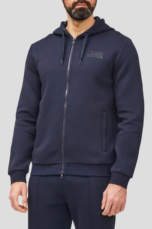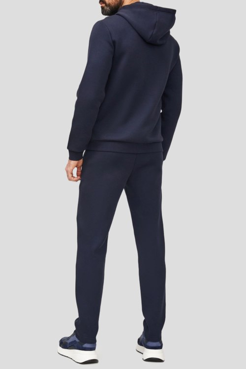 Детали: Мужской темно-синий хлопковый спортивный костюм от Armani (Армани). Кофта: капюшон на завязках, логотип на груди, боковые карманы, застежка-молния, классическая длина, трикотажные манжеты и нижний край. Брюки: эластичный пояс, нашивка логотипа, боковые карманы, низ без манжетов, полная длина