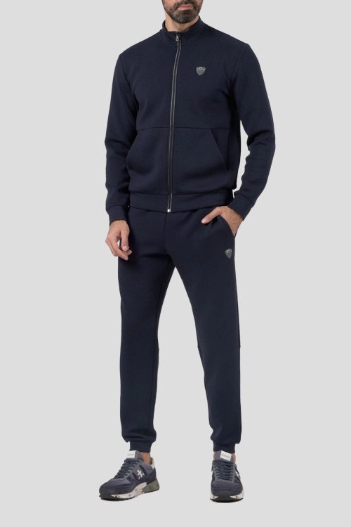 Детали: Мужской темно-синий спортивный костюм из полиэстера и вискозы от Armani (Армани). Кофта на молнии, воротник-стойка, трикотажная резинка на манжетах и по низу изделия, патч-лого, накладные карманы, спортивные брюки с манжетами, прорезные карманы, эластичная резинка на поясе
