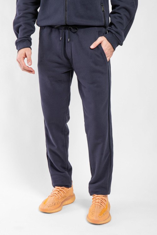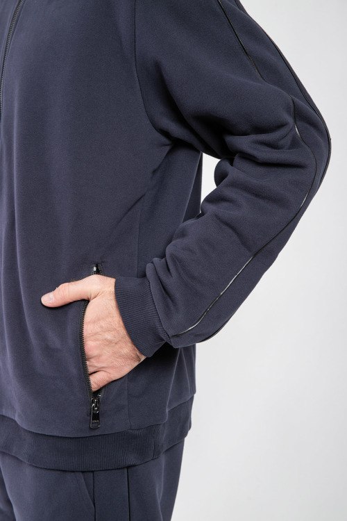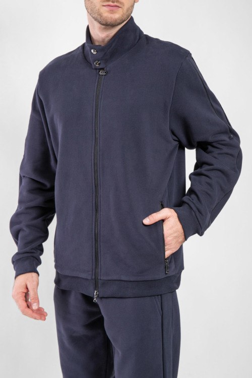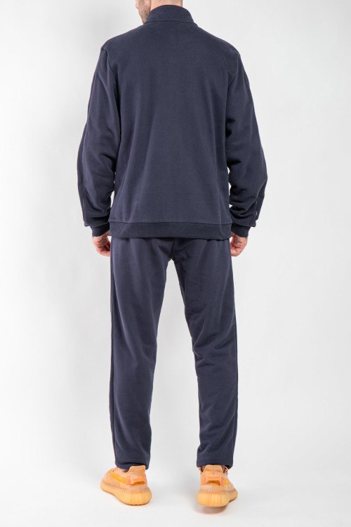 Детали: Мужской темно-синий спортивный костюм из хлопкового микса от Bogner (Богнер). Спортивная кофта на молнии, воротник-стойка на кнопках, манжеты и низ изделия в рубчик, прорезные карманы, брюки классической длины, эластичная резинка на поясе с кулиской, прорезные карманы