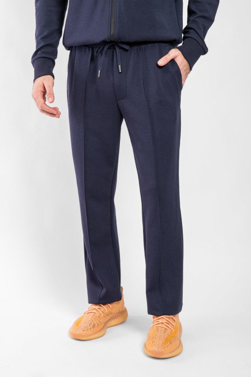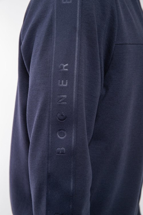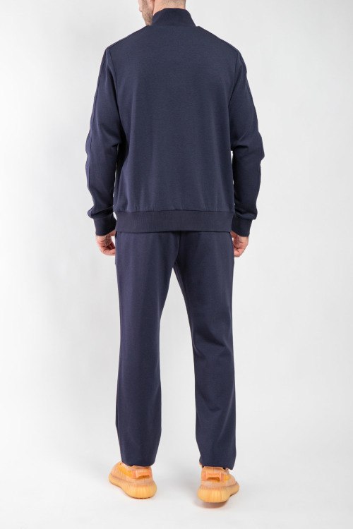 Мужской темно-синий спортивный костюм из хлопкового микса от Bogner (Богнер). Спортивная кофта на молнии, длинные рукава, манжеты и низ изделия в рубчик, прорезные карманы, брендированные лампасы. Спортивные брюки с лампасами, классическая длина, эластичная резинка на поясе с кулиской, прорезные карманы.