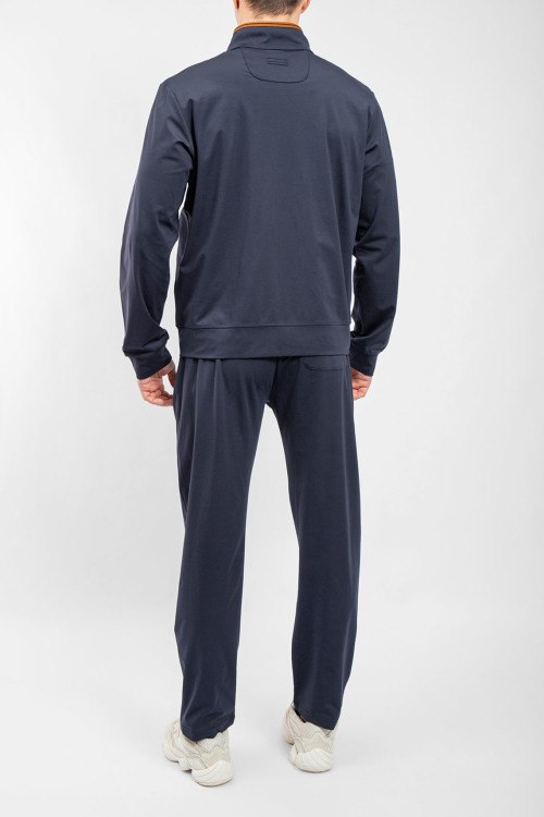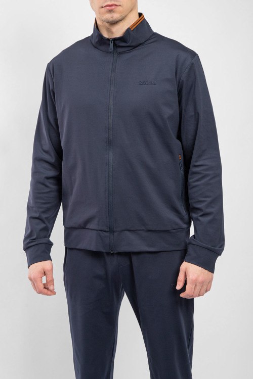 Детали: Мужской темно-синий спортивный костюм от Ermenegildo Zegna (Эрменеджильдо Зенья). Кофта: высокий воротник, логотип на груди, боковые карманы на молнии, застежка-молния, классическая длина. Брюки: эластичный пояс на завязках, боковые карманы, низ без манжетов, полная длина