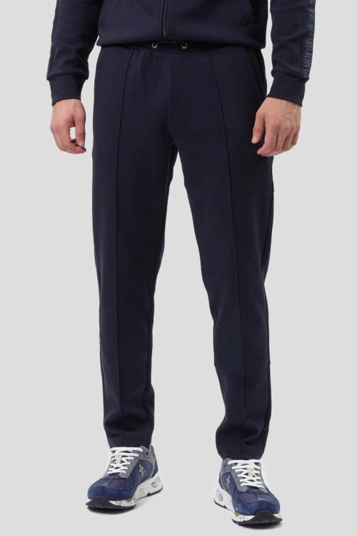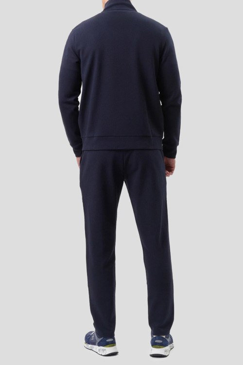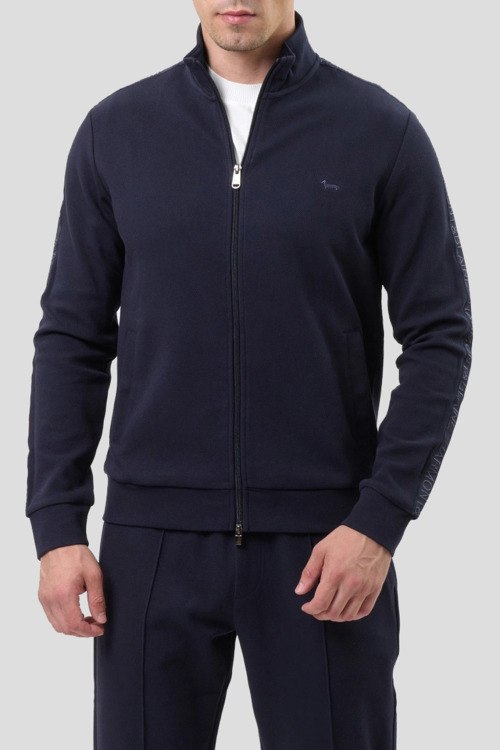 Детали: Мужской темно-синий хлопковый спортивный костюм от Harmont & Blaine (Хармонт энд Блейн). Кофта: логотип на груди, брендированные лампасы вдоль рукавов, боковые карманы, застежка-молния, классическая длина, трикотажные манжеты и нижний край. Брюки: эластичный пояс на завязках, боковые карманы, низ без манжетов, полная длина